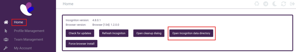 Opening the right data directory: first step is that you need to click on Home in the Incogniton application. The next step is that you click on Open Incogniton data directory.