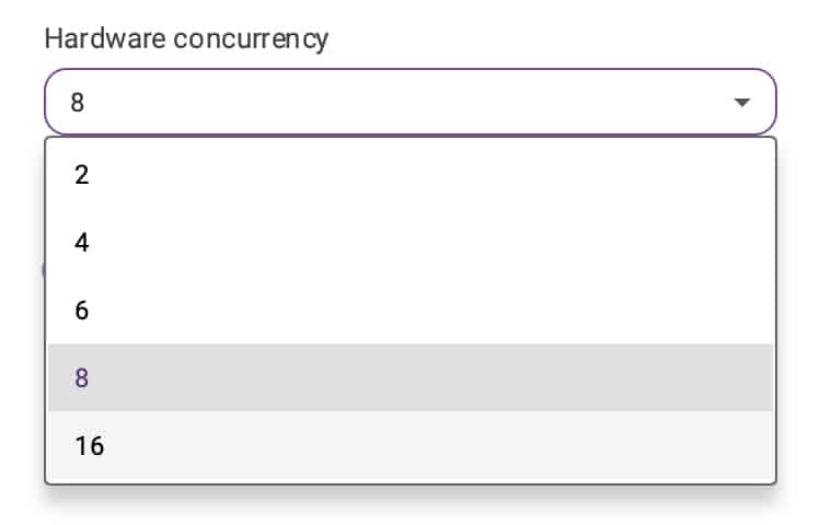The hardware concurrency setting is a navigator parameter that shows the number of CPU processors that are available on a computer of a user. When you decide to change these parameters you can use the following values in Incogniton: 2, 4, 6, 8 and 16.