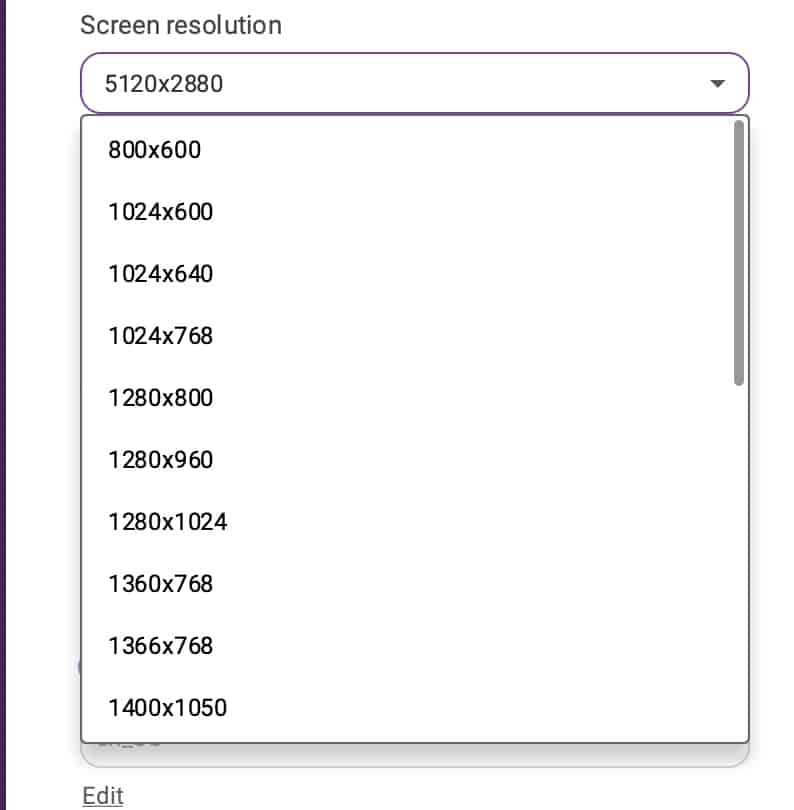 For a fresh created browser profile, the standard screen resolution is used which is set in My Account. However, as a user you can also choose to adjust the screen resolution for a browser profile in Incogniton. You can do this by clicking the dropdown menu and then selecting the desired resolution.